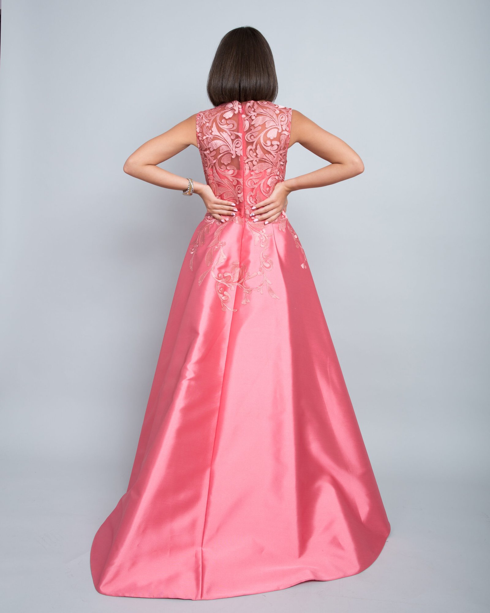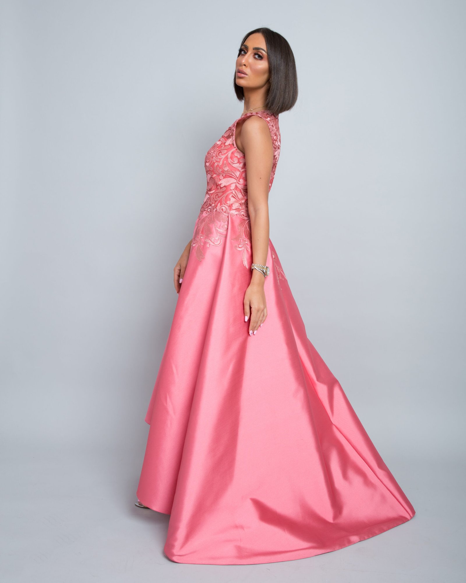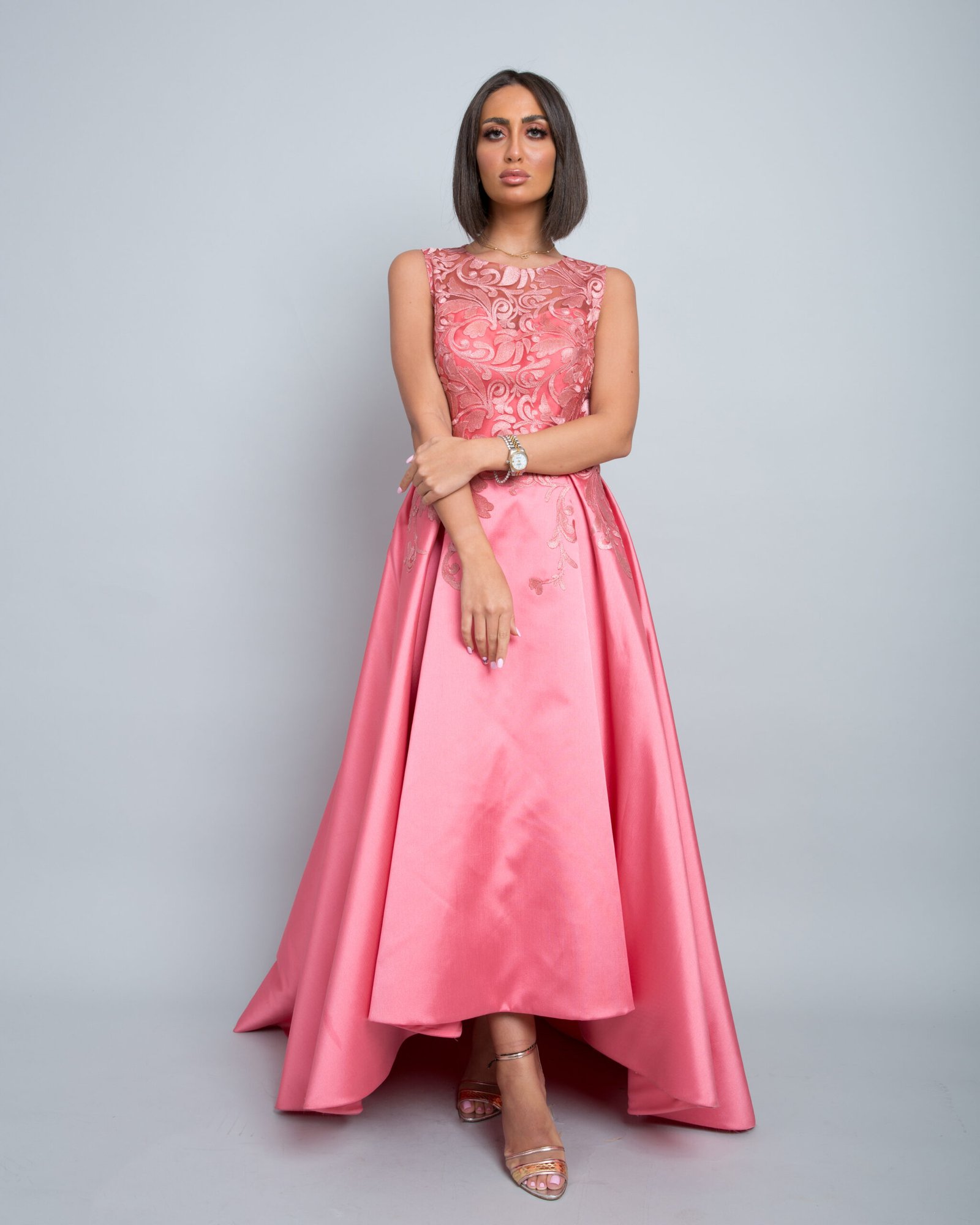 This high-low gown is crafted in a soft coral tone, designed with a structured bodice and a voluminous skirt that creates graceful movement. The sleeveless neckline is adorned with delicate tonal embroidery, adding subtle texture and dimension. The elongated silhouette balances elegance and modern femininity with a refined finish.