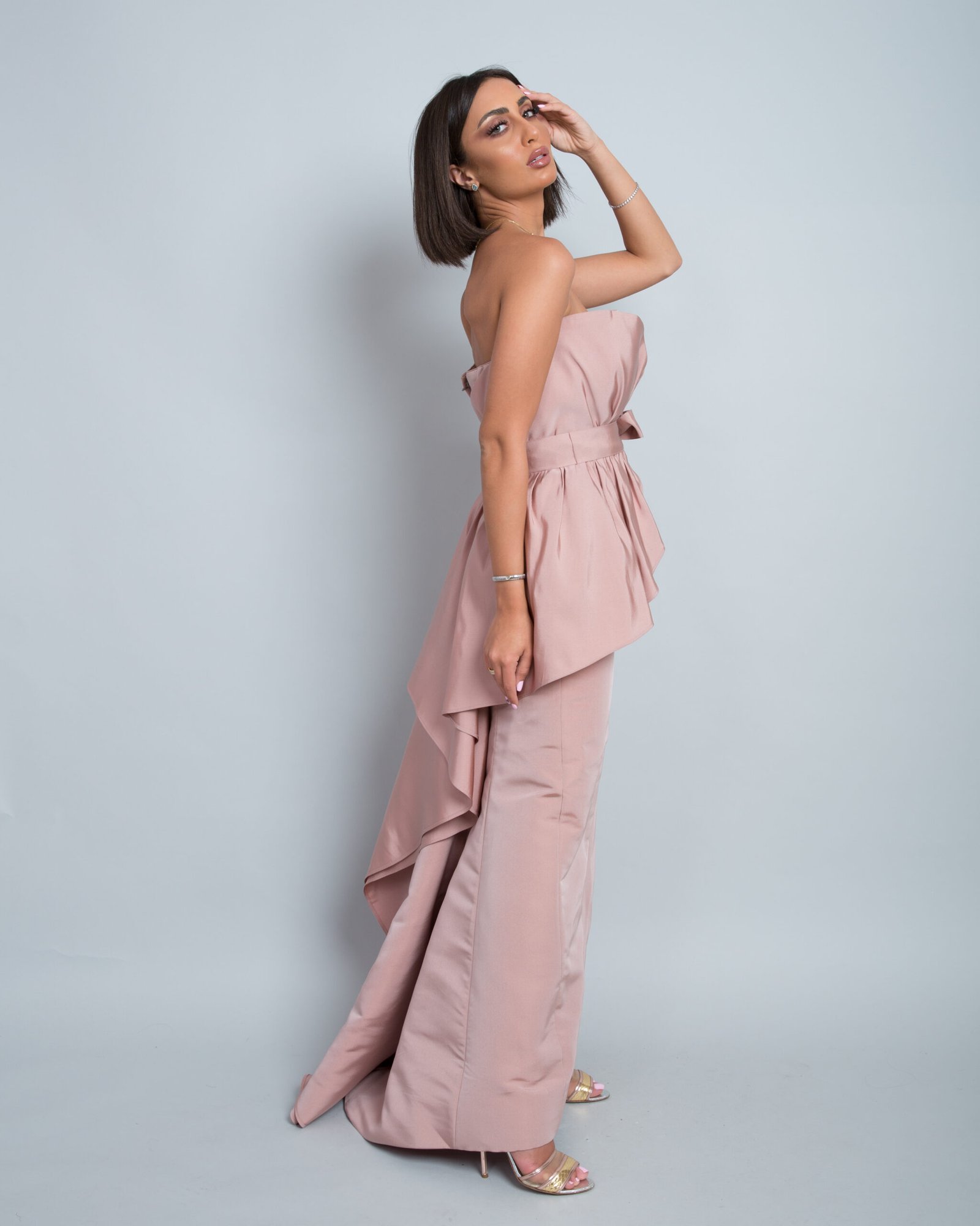 A modern blush strapless gown defined by its sculpted bodice and elegant peplum detail at the waist. The clean, column silhouette elongates the figure, while the soft structured fabric adds understated sophistication. Effortlessly refined, this piece is perfect for contemporary evening elegance.