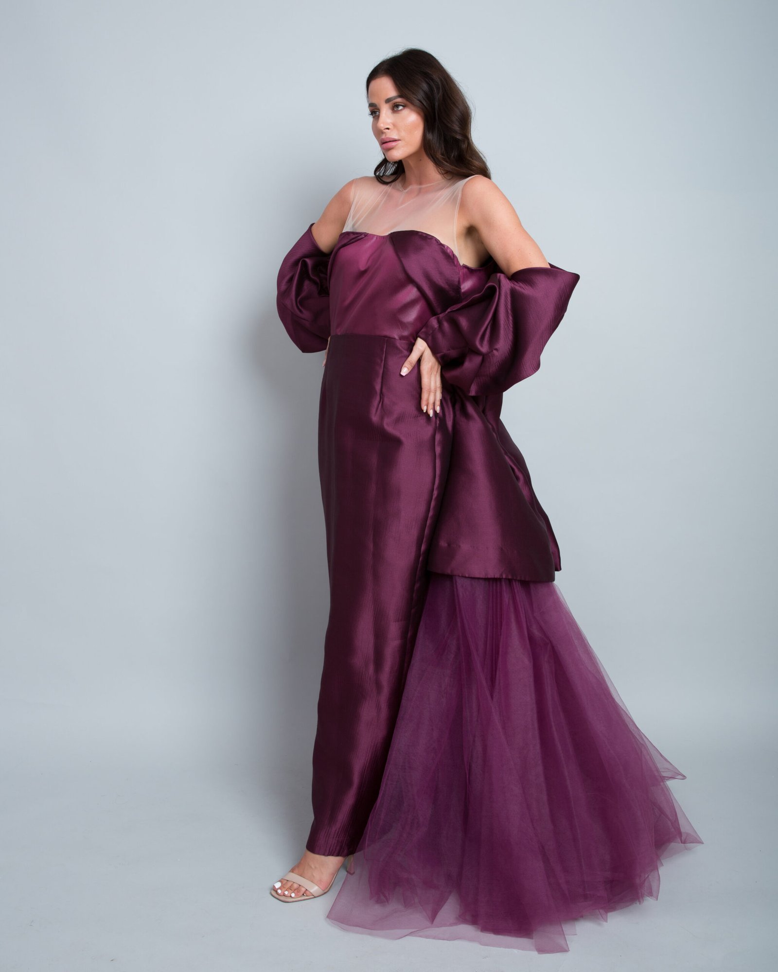 A striking plum evening gown designed with a structured satin silhouette and dramatic off-shoulder balloon sleeves. The bodice features a subtle sheer illusion neckline, while the fitted waist flows into a sleek column skirt layered over soft tulle panels that add volume and movement. Bold yet refined, this piece balances architectural structure with romantic texture for a powerful statement look.