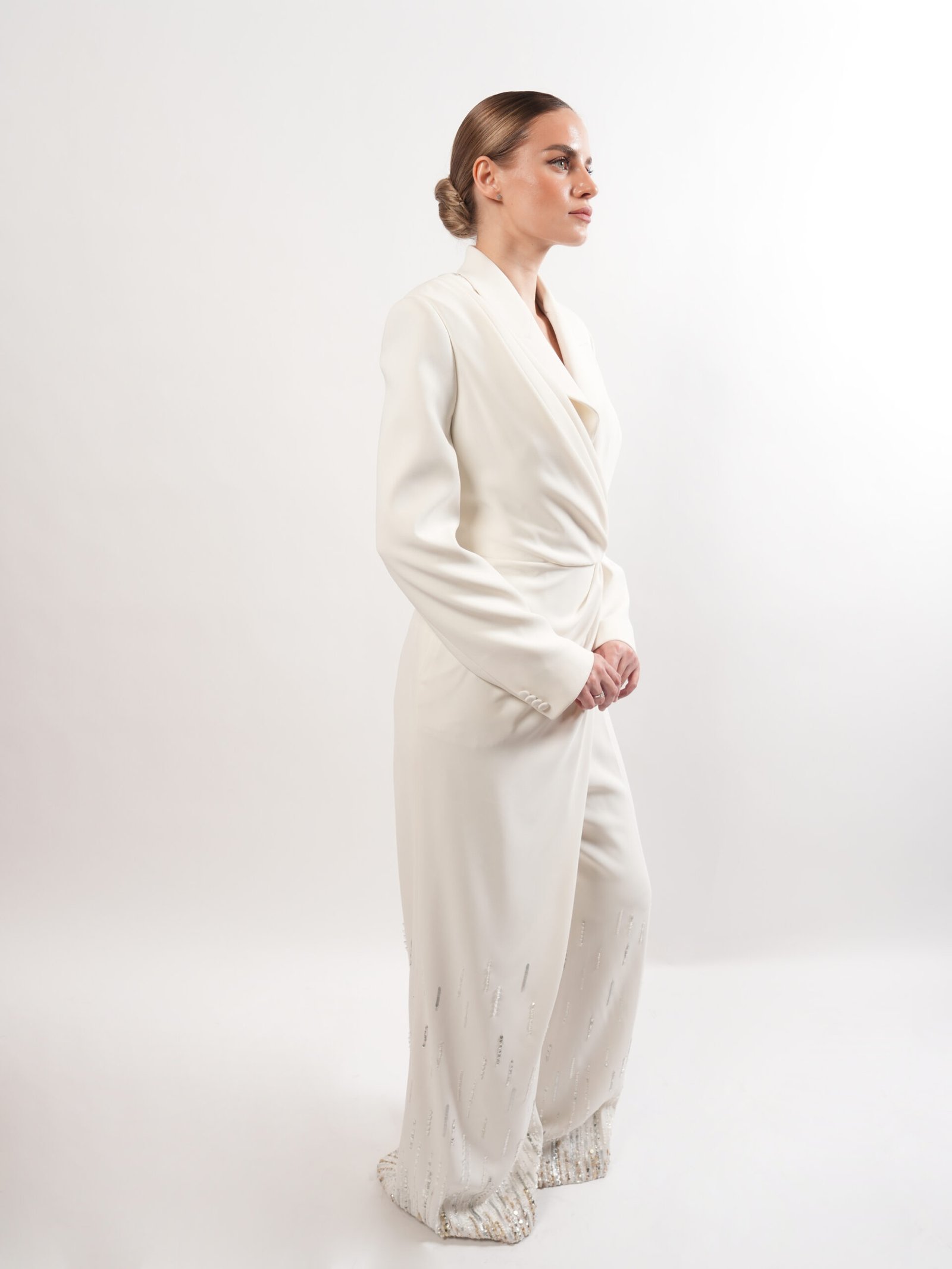 This floor-length gown is crafted in a soft ivory tone, defined by a sleek, sculpted silhouette that gently flares at the hem. The deep illusion neckline is delicately adorned with refined embellishments, adding subtle luminosity against the minimalist structure. Long sleeves and precise tailoring enhance its graceful, timeless elegance