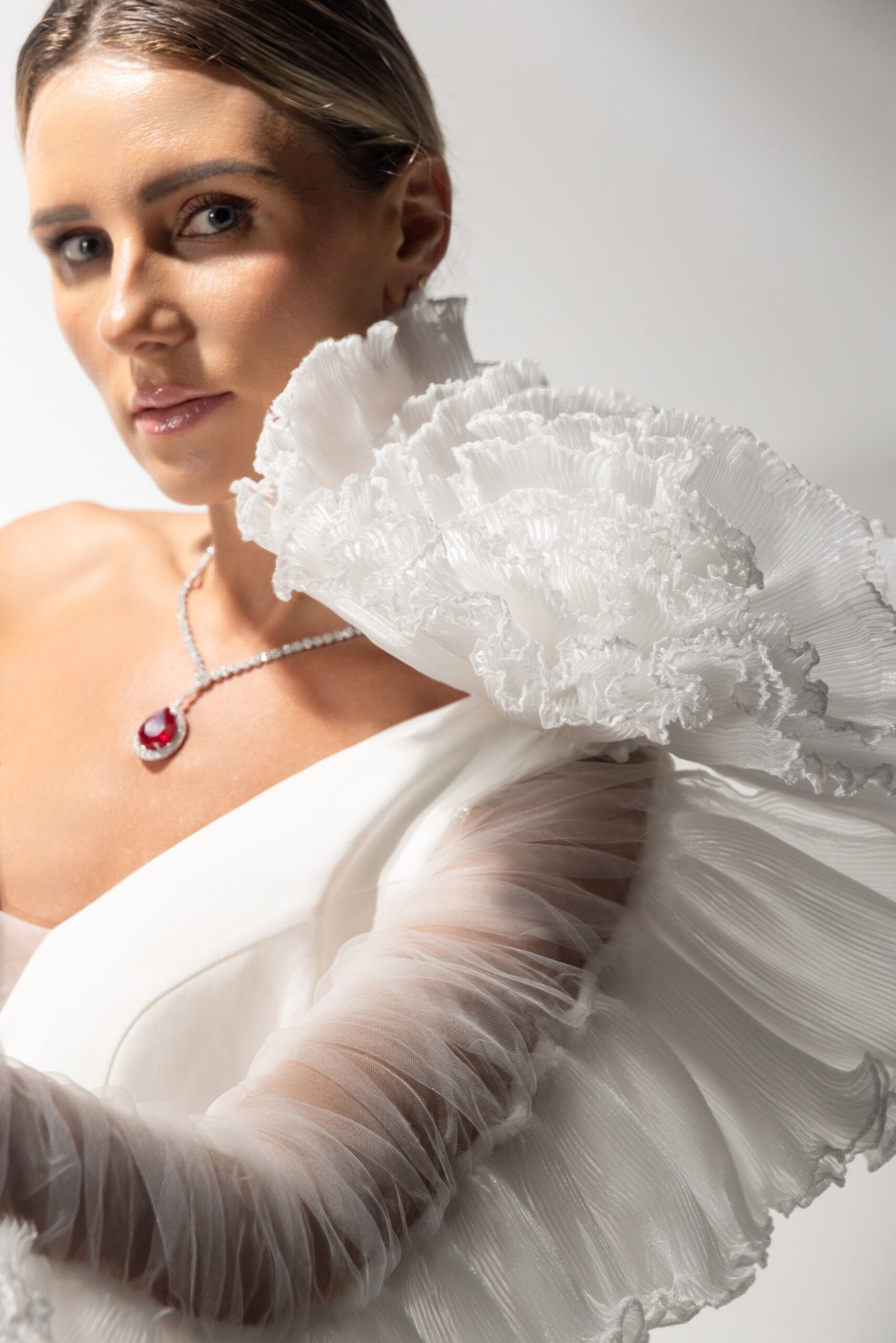 This floor-length ivory gown is designed with a sculpted bodice that enhances the silhouette with clean architectural lines. The sheer long sleeves are delicately textured with subtle floral appliqué, introducing softness and dimension while preserving a contemporary aesthetic. A fluid skirt falls gracefully to the floor, creating effortless movement and understated drama.