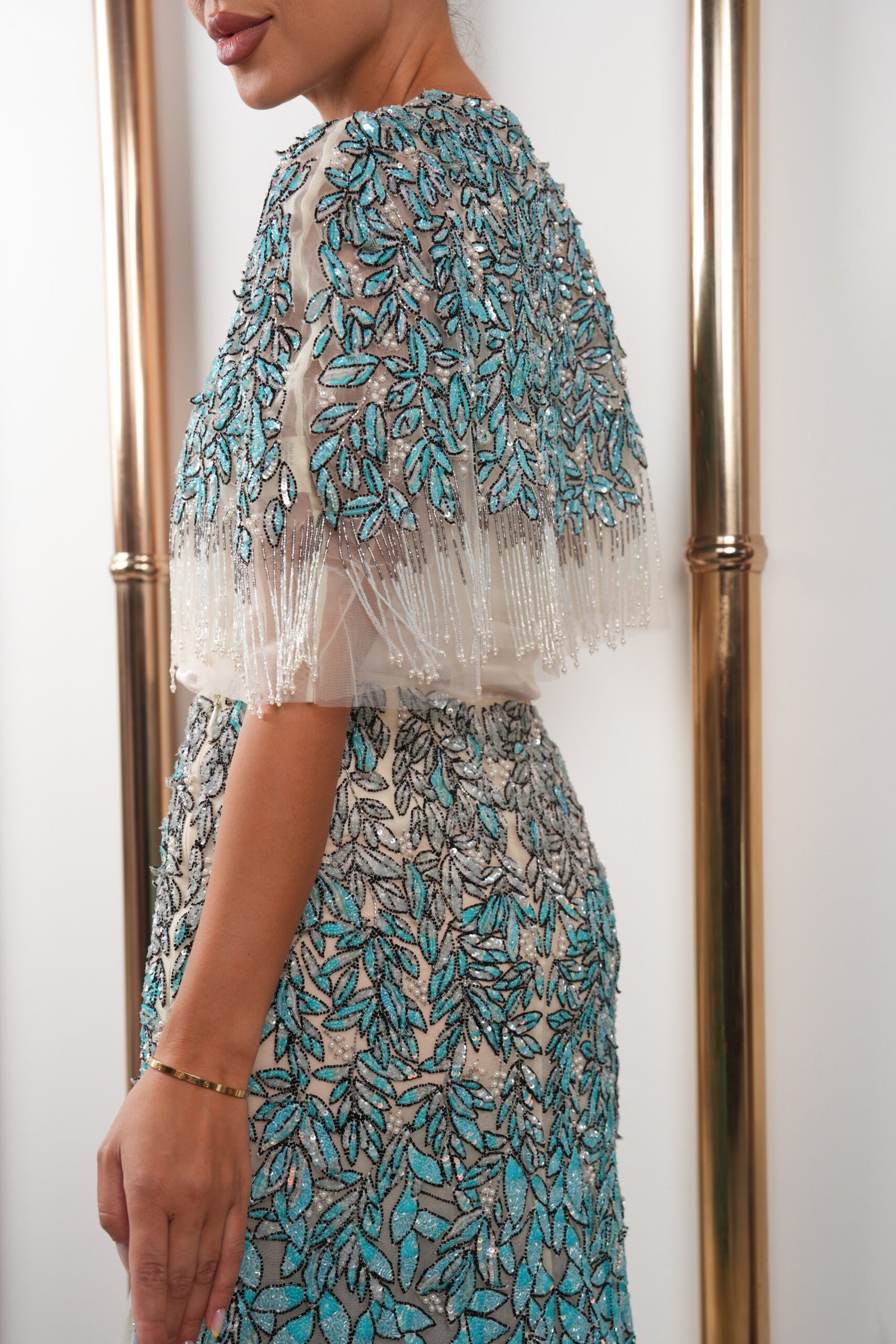 A refined ensemble featuring a fluid ivory base layered with a sheer, hand-embroidered overlay in soft turquoise and silver tones. The cropped cape-style top is finished with delicate beaded fringe along the hem, while the matching skirt showcases intricate leaf-inspired embellishment and a softly flared tulle finish. Light yet structured, this design offers a fresh interpretation of evening wear, ideal for elegant occasions with a modern edge.