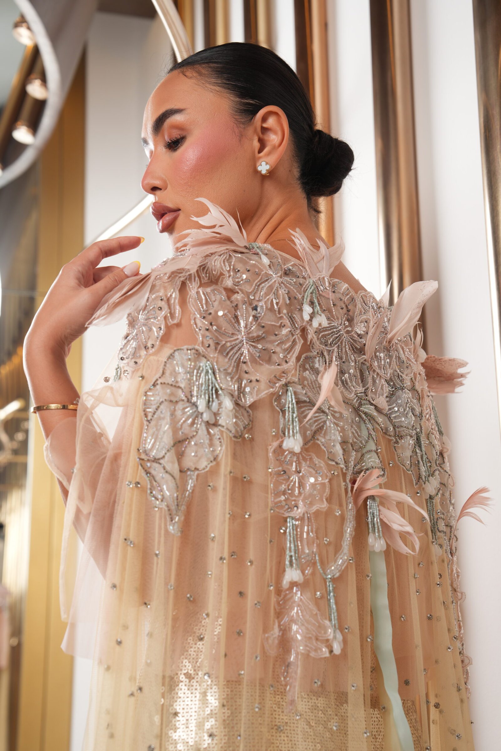 A luminous ivory sequin gown layered with a sheer tulle cape delicately embellished with tonal beadwork and soft floral appliqué. Designed with short sleeves and a fluid, elongated silhouette, the piece plays with transparency and shimmer while maintaining an elegant sense of coverage. Light-reflective yet refined, it’s crafted for elevated evening occasions and formal celebrations.
